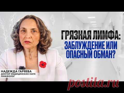 На изображении представлена женщина в белом пиджаке, её волосы волнисты и каштанового цвета. Она смотрит прямо в камеру с нейтральным выражением лица. На фоне виден размытый интерьер, вероятно, коридор медицинского учреждения, что создаёт атмосферу профессионального обсуждения. Светлые тона в интерьере подчёркивают строгий и деловой стиль. На пиджаке прикреплён ярко-красный цветок, что добавляет контраста и символизирует возможно важность темы. Женщина представлена как доктор медицинских наук, лимфолог, что видно по тексту рядом с ней. Видно, что текст "Грязная лимфа: Заблуждение или опасный обман?" расположен на изображении. Эта комбинация изображает научный и критический подход к теме. Освещение в кадре мягкое, создаёт приятный фон для визуального восприятия. Перспектива кадра направляет взгляд на центральную фигуру, подчёркивая её значимость в контексте обсуждаемой темы.