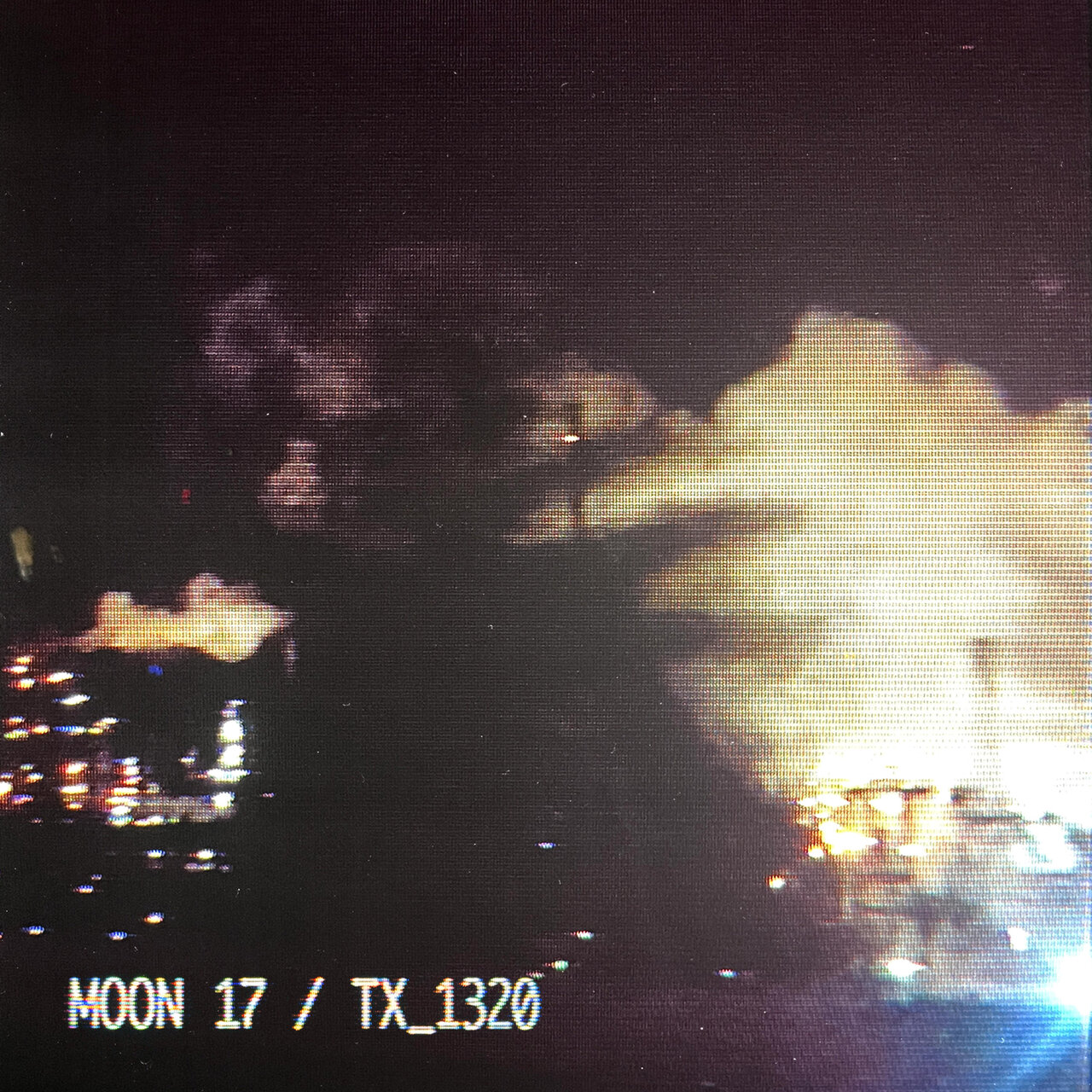 Изображение демонстрирует загадочный ночной пейзаж. Плотные облака дыма поднимаются из центра сцены, создавая эффект таинственности на темном фоне. Структура изображения напоминает кадр из научно-фантастического фильма или видеоигры. В левой части фото видны разноцветные огни, мерцающие в ночи, возможно, это элементы городского пейзажа или технических установок. Яркое освещение в нижнем правом углу может означать наличие источников светового загрязнения, например, заводского комплекса или станции. На экране виден текст "Moon 17 - TX_1320 (2025) 320kbps / FLAC", что создает футуристическую атмосферу, возможно, указывая на связи с технологическими или медийными аспектами. Линейчатая структура изображения добавляет эффект старого телеэкрана или электронного устройства. Цветовая гамма включает темные тона коричневого и черного, с яркими световыми вкраплениями, усиливающие эффект погружения в атмосферу сцены.