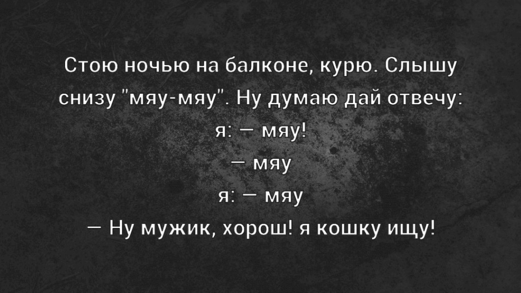 Изображение представляет собой текст на темном фоне, где центрировано расположено несколько строк анекдота на русском языке. Текст имеет белый цвет, четко выделяясь на сером фоне, который напоминает текстуру бетона или асфальта. Это создает атмосферу ночного времени, упомянутого в анекдоте. Шрифт прост и лаконичен, без засечек, что облегчает восприятие текста. Внизу справа выделяется слово, набранное красным курсивом, что добавляет контраста и акцента. Комичная история о человеке, который ночью на балконе, отвечает на мяуканье, создает легкое и юмористическое настроение. Эта забавная сценка, вероятно, отражает некое недоразумение или шутку, связанную с человеческой склонностью отвечать на звуки, а затем была частью материала информационного портала, посвященного анекдотам, возможно, размещенного на сайте “вокруг смеха”, что подчёркивает развлекательный характер источника. В этой короткой истории упоминается легкий доворот событий, где мужчина искавший кошку стал невольным участником юмористического диалога.