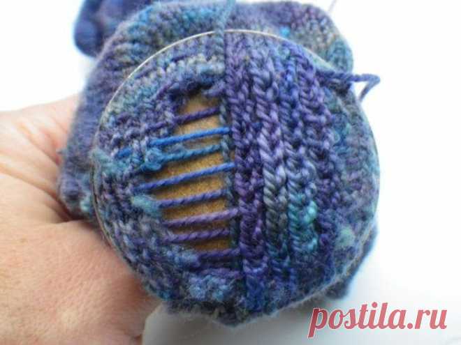 На изображении крупным планом видно, как аккуратно заштопана шерстяная вещь, используя технику ручного штопания. Центральным элементом является круглая часть ткани, выполненная в различных оттенках синего и фиолетового, создающих плавные переходы. Используемые нити и техника переплетения подчеркивают текстурированную поверхность, создавая визуальную глубину. На фоне можно заметить руку, которая поддерживает изделие, а также деревянную основу, которая придает устойчивость. В правом нижнем углу видна надпись на русском языке, нанесенная красным цветом. Светлая и естественная цветовая палитра создает атмосферу уюта и тепла. Изображение может быть связано с такими темами, как сохранение экологии благодаря ремонту одежды и возрождению старинных практик штопки. Композиция сосредоточена на процессе творчества и бережного отношения к вещам, отражая тренды устойчивой моды и ручного труда.