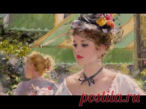 На картине изображены две женщины, находящиеся на открытом воздухе, возможно, на террасе кафе или в саду. На переднем плане молодая женщина с элегантной прической, украшенной шляпкой с цветами, символизирующими весеннее или летнее время года. Её кожа светлая, губы ярко-красного цвета. Внимание к деталям одежды: женщина одета в белое платье с вырезом, с черной лентой вокруг шеи. На её лице легкий взгляд печали или задумчивости, глаза смотрят в сторону, создавая в образе внутреннюю интроспекцию. Позади неё, другая женщина с собранными волосами, одетая в пиджак светлого оттенка, смотрит в сторону, возможно, общаясь с кем-то. Фон изображает зелёный балдахин и деревья, передающие летний пейзаж. Свет падает мягко, подчеркивая текстуру и детали картины; возможно, это утро или полдень. Общая атмосфера произведения – задумчивая и романтичная, напоминающая импрессионистский стиль работы.