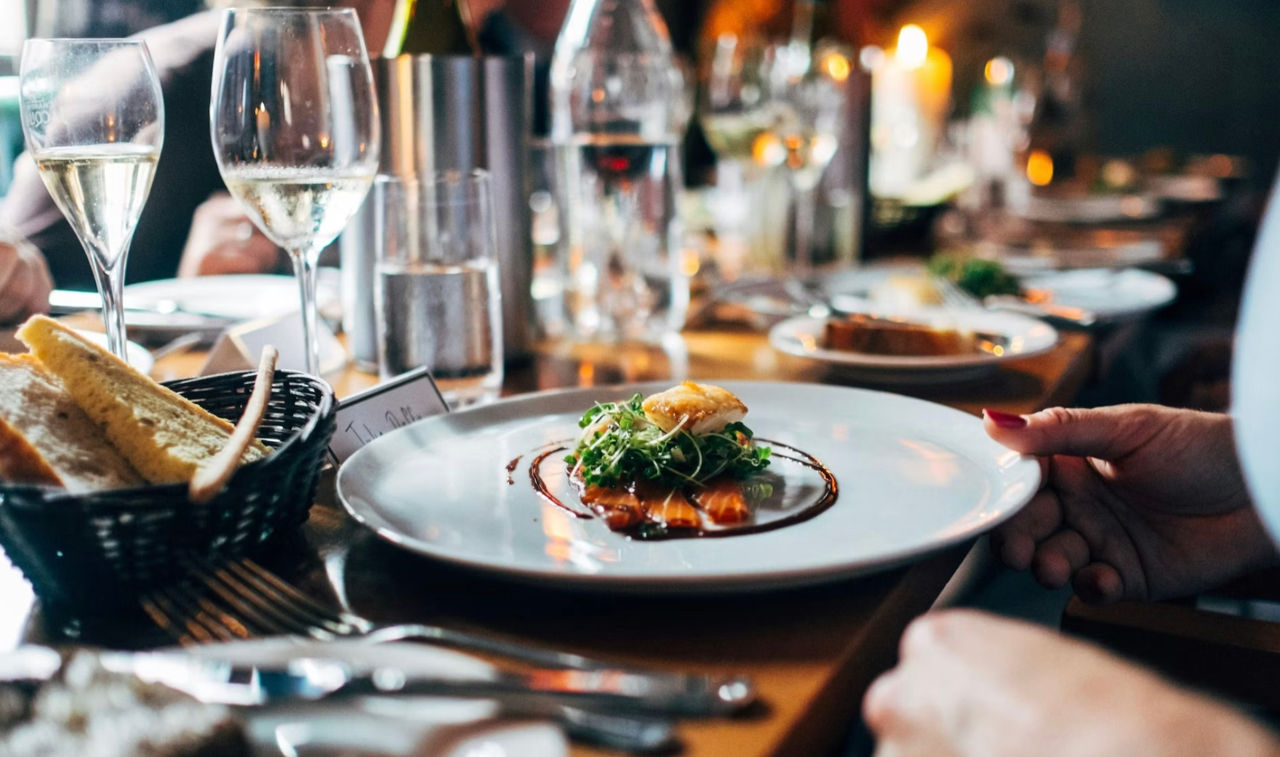 Изображение демонстрирует утонченный ужин в элегантной обстановке. В центре внимания находится изысканное блюдо, сервированное на белой тарелке. Это гастрономическое произведение искусства включает кусочки аппетитного мяса, украшенные зеленью и политы соусом. Тарелка расположена на столе в окружении бокалов для белого вина из прозрачного стекла, отражающих мягкий свет. На столе также видно небольшую корзинку с хлебом, подчеркивающую свежесть и уют обстановки. Атмосфера теплая благодаря живому свету свечей на заднем плане, создающему атмосферу уюта и интимности. Люди за столом одеты в современный стиль, их жесты и позы говорят о наслаждении беседой и трапезой. Композиция кадра сбалансирована, создавая эффект неповторимой атмосферы, как в лучшем ресторане мира.