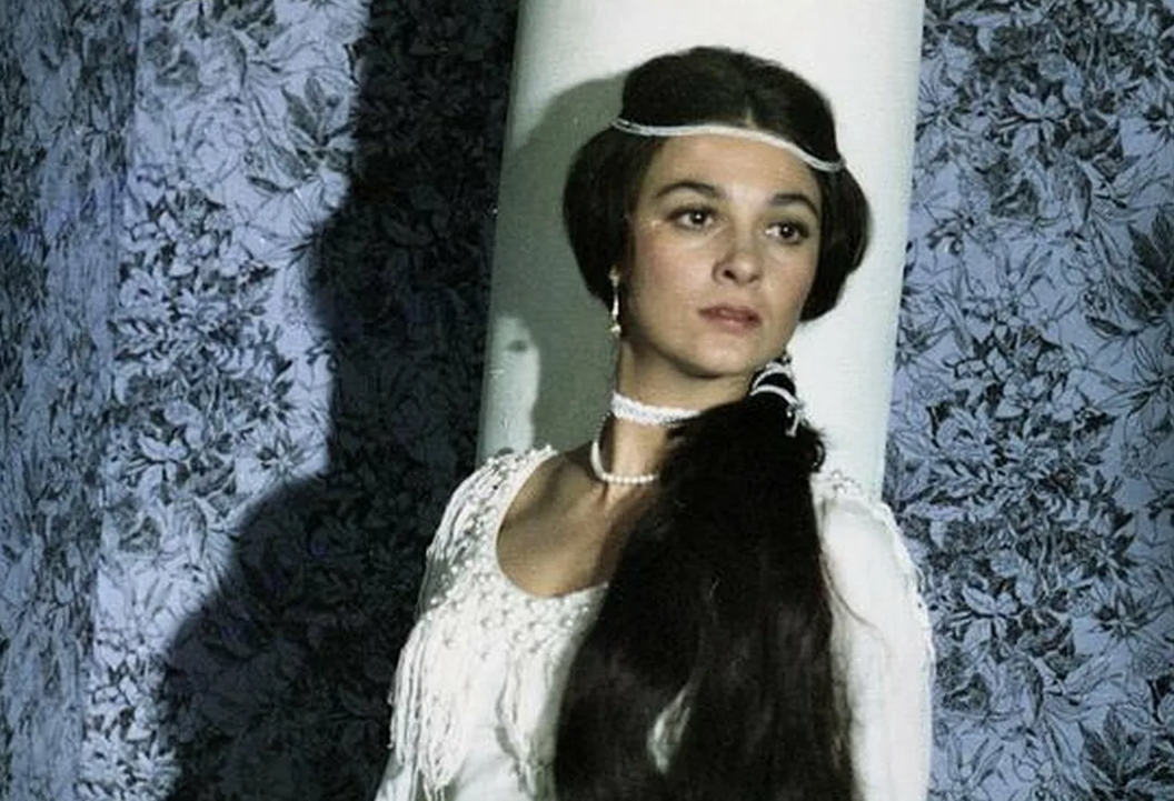 На изображении запечатлена женщина в длинном белом платье, богато украшенном вышивкой и бусинами, создающими аристократичный и элегантный вид. Ее густые темные волосы собраны в длинную косу, подчеркивая естественную красоту и изящество. На ее голове изящно расположена тонкая серебристая лента, придающая образу дополнительную изысканность и утонченность. Женщина носит жемчужное ожерелье, что создает гармонию с остальными элементами одежды. Ее выразительное лицо передает спокойствие и уверенность, взгляд устремлен в сторону, как бы мечтательный и задумчивый. Фон изображает богатую текстуру обоев с цветочным узором в оттенках синего и фиолетового, создавая контраст с белым столбом позади фигуры. Освещение мягкое и рассеянное, выделяющее черты лица и детали наряда. Общее настроение на фото романтическое и слегка меланхоличное, перенесенное в эпоху с атмосферой, связанной с именем Светланы Тома.