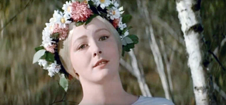На изображении представлена молодая женщина с добрым и нежным выражением лица, одетая в белоснежное платье простого покроя. Она украшена красочным венком из полевых цветов, в котором преобладают розовые и белые лепестки, а также зеленые листья. На заднем плане виднеется береза, что может быть указанием на русскую природу. Свет успокаивающего дневного времени мягко обрамляет ее лицо, добавляя изображению атмосферу безмятежности. Светлые волосы обрамляют лицо девушки, придавая ей еще больше мягкости. Она смотрит в объектив камеры с легкой полуулыбкой, создающей ощущение легкости и романтичности. Атмосфера кадра наполнена ощущением природной гармонии и спокойствия, что подчеркивается цветовой палитрой из нежных пастельных тонов.