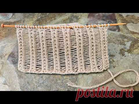 На изображении виден фрагмент вязания на спицах, выполненный из светлой пряжи, вероятно, из хлопка или льна. Основной узор состоит из вертикальных полос с чередованием плотных и более редких петель, создавая эффект лёгкости и ажурности. На фоне грубой поверхности камня фокус удерживается на текстуре вязания благодаря тёплому свету, который акцентирует внимание на деталях. Спицы деревянные, светло-коричневого цвета, хорошо сочетающиеся с нейтральным тоном пряжи. Освещение естественное, придающее изображению мягкость и уют, подчёркивая ручную работу, которая могла бы быть частью более крупного проекта, например, связанного пледа или шарфа. Техника вязания предполагает сложные манипуляции с петлями, которые подчёркиваются надписью, упоминающей, что если спустить каждую 4-ю петлю в резинке, можно получить очаровательный узор, что говорит о мастерстве и изобретательности создателя. Атмосфера кадра располагает к творческому процессу, вниманию к мелочам и изучению тонкостей вязального ремесла.