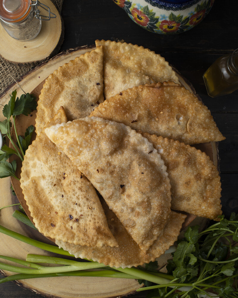 На изображении видны традиционные кулинарные изделия, которые лежат на круглой деревянной доске. Это чебуреки – золотистые жареные пирожки с хрустящей корочкой. Они имеют полукруглую форму и аппетитный румяный цвет. Текстура теста выглядит пузырчатой и нежной. Рядом с доской расположены свежие зелёные лук и петрушка, что добавляет цветной контраст и создаёт ощущение свежести. На заднем плане на чёрной поверхности стоит банка с маслом и стеклянная ёмкость с пробкой, вероятно, с приправой внутри, а также вазочка с цветочным узором, что придает композиции нотки домашнего уюта. Освещение мягкое, тёплое, подчеркивает текстуру и цвета изделий, создавая уютную атмосферу. Композиция сбалансирована, и все элементы гармонично расположены на фоне. Этот натюрморт может быть связан с крымскотатарской или восточной кухней благодаря блюдам и декоративным элементам.
