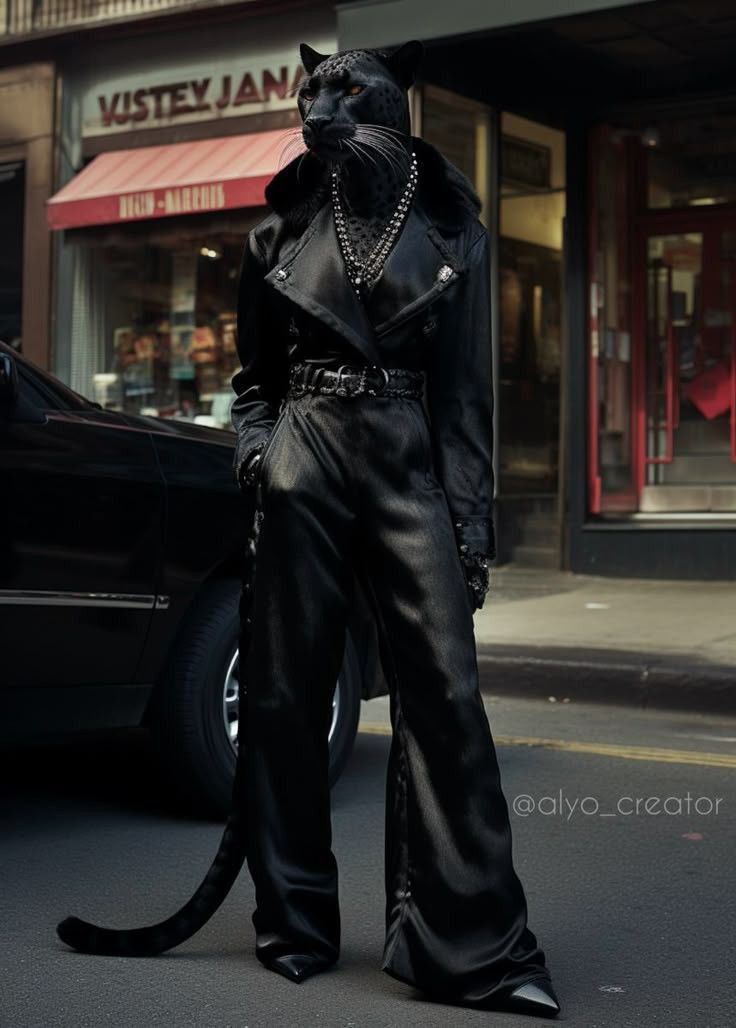 Изображение представляет собой креативную городскую сцену с фигурой, которая сочетает в себе черты человека и черной пантеры. На переднем плане находится высокое существо с обликом пантеры, одетое в стильный черный ансамбль. На фиксированной талии, подчеркнутой поясом, надета куртка с широкими плечами и глубоким воротником. Штаны из плотной ткани спадают свободно, создавая элегантный и таинственный вид. Фигура стоит на улице, на фоне видны витрины магазинов с названиями, написанными латиницей. Одна из витрин украшена красными деталями. Композиция кадра создает впечатление позднего вечернего освещения, возможно, из-за теплых оттенков уличного освещения. Внимание также привлекают аксессуары на фигуре: цепочка из крупных серебристых бус. Атмосфера соответствует статусу и загадочности, контрастируя с повседневной обстановкой городских улиц. На изображении видно текст ‘Пин на доске Stylish Vertabrates😎’, что добавляет элемент современного цифрового присутствия.
