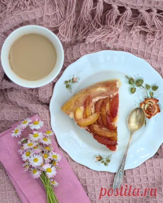 На изображении представлена уютная натюрмортная композиция, в центре которой находится кусок творожного пирога с персиками на песочном тесте. Пирог лежит на изящной тарелке белого цвета с цветочным декоративным узором. Рядом с тарелкой расположена серебристая ложка с изысканным орнаментом на ручке. Кажется, что пирог имеет аппетитную текстуру, цвета персиков варьируются от золотистого до насыщенного красного, создавая визуальное разнообразие. Слева от тарелки стоит чашка с напитком кремового оттенка, возможно кофе или чай с молоком. На розовой салфетке рядом лежит небольшой букет бело-розовых ромашек, добавляющих свежесть и нежность в общий вид композиции. Через всю сцену проходит плед вязаной текстуры розового цвета, создающий атмосферу уюта. Свет на изображении мягкий, дневной, что придаёт ощущения тепла и спокойствия. Все элементы расположены гармонично, передавая домашнее и уютное настроение.