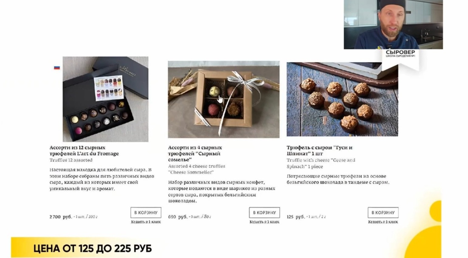 На изображении представлен скриншот интернет-магазина с предложениями по продаже сыра, шоколада и трюфелей. В центральной части кадра расположены три карточки товара. Слева показан набор из 12 сырных трюфелей в черной коробке с цветными шариками и белой подписью. В центре заметна картонная коробка с четырьмя трюфелями, перевязанная белой лентой. Справа видны 6 трюфелей на деревянной доске. В правом верхнем углу находится вставка с изображением мужчины в темной одежде, с подписью "Сыровар". Фон изображения белый с желтыми акцентами, текст на карточках товара выполнен на русском языке, с указанием цен в рублях и описанием каждого набора. Светлое освещение равномерно распределено по всей композиции.