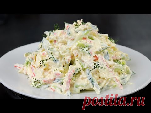 На изображении представлено аппетитное блюдо - салат с крабовыми палочками, расположенный на белой тарелке. Основные ингредиенты включают крабовые палочки, которые нарезаны полосками, а также свежие огурцы и, возможно, зеленый лук, придающие салату свежесть. Важным элементом кажется легкая майонезная заправка, равномерно покрывающая все компоненты. Вверху салат украшен небольшими веточками укропа, добавляющими аромата и эстетики блюду. Общая картина создает ощущение свежести и домашнего уюта, благодаря светлым пастельным тонам ингредиентов. Черный фон усиливает контрастность, делая блюдо более выразительным в центре композиции. Визуально салат выглядит объемно благодаря слоистости и градации текстур, начиная от мягких крабовых палочек до хрустящих элементов. Это блюдо отлично подойдет для домашнего ужина или праздничного стола, создавая уютную атмосферу. Рядом с изображением размещён текст, способствующий восприятию блюда как простого и доступного для приготовления в домашних условиях.