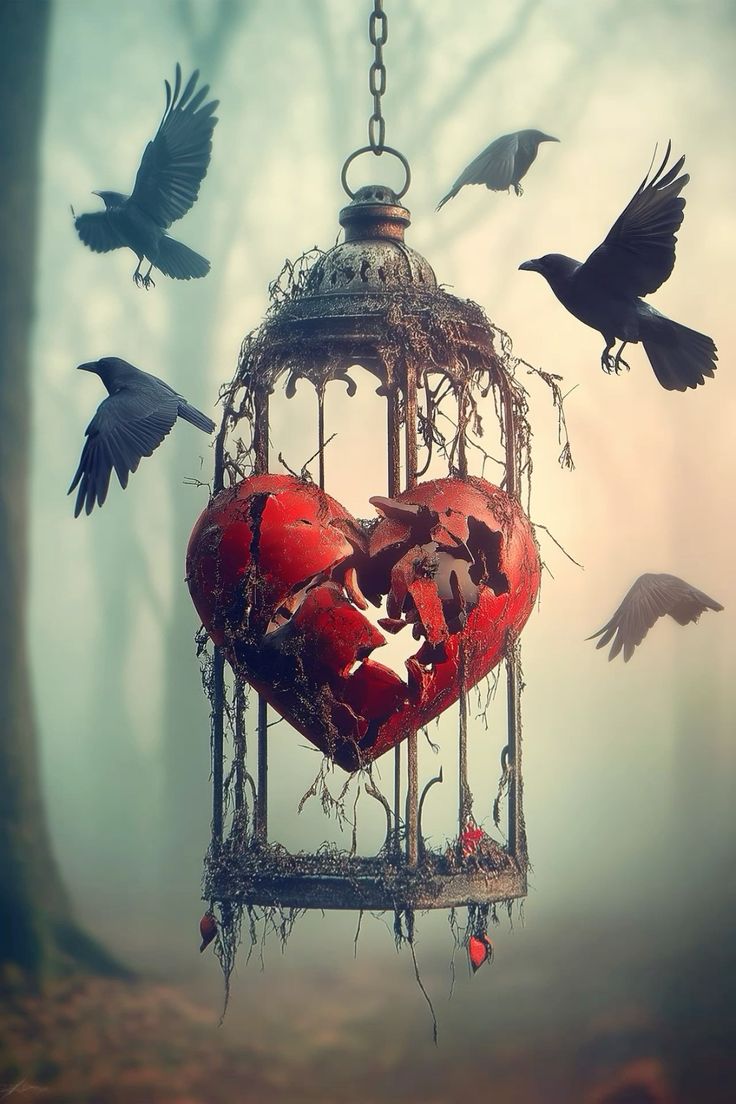 На изображении представлена таинственная и мрачная сцена, в которой центральное место занимает ветхая металлическая клетка, подвешенная в пространстве. Внутри клетки находится разорванное красное сердце, символизирующее разбитую любовь или разрушенный союз. Сердце обвито мхом и грязью, что добавляет ощущение заброшенности и упадка. Вокруг клетки кружат вороны, которые своим присутствием усиливают атмосферу мистики и загадочности. Их черные силуэты контрастируют с туманным фоном серо-зеленых тонов, создавая впечатление леса, погруженного в легкий туман. Освещение рассеянное, без ярких источников света, что придает сцене мечтательное и несколько сюрреалистическое настроение. Изображение наполнено символизмом и может ассоциироваться с темой приворота, где человек узнает, что был подвергнут магическому воздействию, и раздумывает над ситуацией, стараясь найти решение. Этот элемент тесно переплетается с текстом, который говорит о привороженном мужчине, узнавшем о своем положении, и о последствиях такого знания.