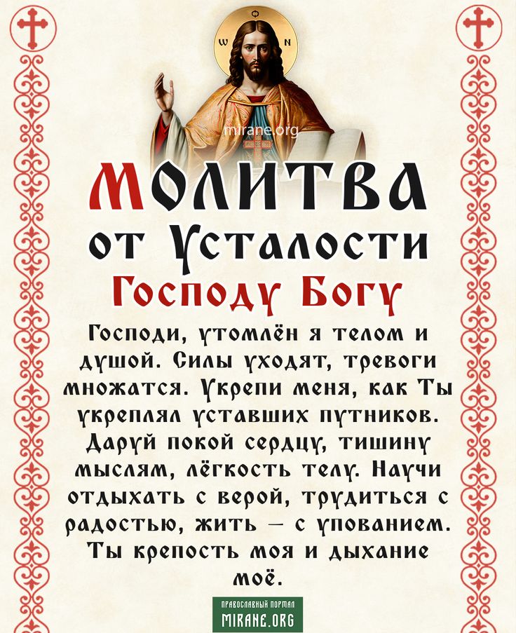 На изображении представлен молитвенный текст, расположенный на фоне изображенного Иисуса Христа в традиционном православном стиле. Христос, одетый в багряный хитон с золотым нимбом вокруг головы, изображен с поднятой правой рукой в жесте благославления, а в левой руке держит открытую книгу. Вокруг текста украшение в виде красного узорчатого орнамента. Основной молитвенный текст представлен в центре, выполнен черным и красным цветами, подчеркивая важные моменты. В верхней части текста выделены слова "Молитва от усталости Господу Богу", которые привлекают внимание крупным шрифтом. В нижней части виден адрес "mirane.org", что указывает на источник. Свечение вокруг Христа создает ощущение святости и духовности, усиливая атмосферу молитвы и благоговения. Композиция тщательно выстроена, создавая баланс между текстом и изображением, что делает изображение визуально притягательным и гармоничным.