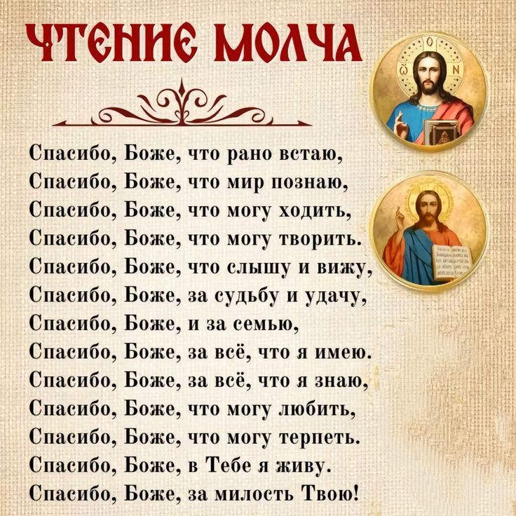 Изображение представляет собой текстовое оформление в религиозном стиле. В верхней части изображения крупными красными буквами написано "ЧТЕНИЕ МОЛЧА" на фоне текстурированной поверхности, напоминающей ткань теплых оттенков. Текст молитвенных благодарностей расположен по центру листа, написан чёрными буквами и включает благодарности Богу за различные аспекты жизни. В правой части находятся два иконических изображения Иисуса Христа, украшенные золотыми ореолами. Верхнее изображение показывает Христа с поднятой рукой и книгой, символизируя мудрость и божественное руководство, а нижнее изображение показывает Христа с жестом благословения. Текстуры и цветовая гамма складывают впечатление святости и благодарности, усиленное гармоничным сочетанием визуальных элементов. В нижнем правом углу расположен логотип "postila.ru" ярко-красного цвета, который добавляет современный акцент к традиционному оформлению.