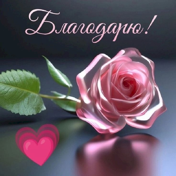На изображении представлена розовая роза с гладкими шелковистыми лепестками, окруженная зелеными листьями. Цветок лежит на темной поверхности, создавая мягкие отражения. Свет освещает розу, подчеркивая текстуру лепестков и насыщенность цвета. В верхней части изображения написано слово "Благодарю!" изящным курсивным шрифтом, подарковая карточка или поздравительный месседж с чувством признательности. Слева виден сердечко в розовых тонах, усиливающее атмосферу благодарности и эмоциональной теплоты. Нижний правый угол украшен надписью сайта. Цветовая палитра включает розовый, зеленый и черный, создавая гармоничное и утонченное впечатление. Композиция сосредоточена на простоте и символизме, мифической красоте и романтической ауре розы, являющейся универсальным символом любви и благодарности.