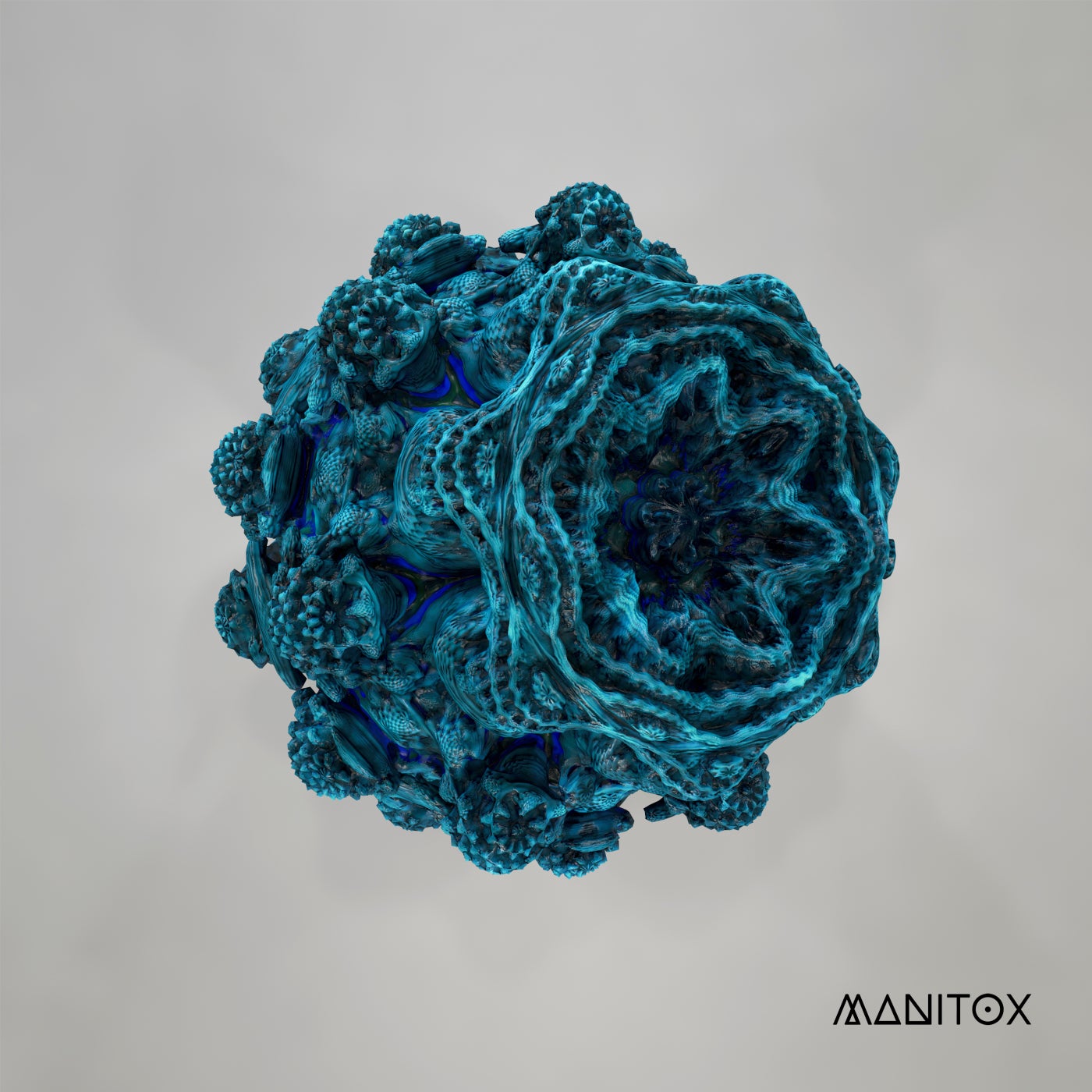 На изображении представлена абстрактная 3D-форма, напоминающая сложную структуру из вязаных элементов. Основной цвет оформления — глубокий синий с бирюзовыми оттенками, что придаёт объекту необычную динамику и глубину. Форма имеет сферическую композицию, где центральная часть составляет сложный узор из множества мелких деталей. Структура напоминает как коралловые рифы, так и архитектурные элементы в стиле барокко, что добавляет ей атмосферу загадочности и величия. Свет мягкий, рассеянный, подчеркивающий текстуру и игре света на поверхности. На фоне серого монохромного босса изображены контрастные и четкие очертания формы. В правой части можно заметить текстовые элементы, из которых выделяются слова "VA - Humans II MAN065" как часть композиции. Текст выполнен в чёрном цвете, дополняя контраст цветовой гаммы. Предметы такого типа могут интерпретироваться как символ переживаний человека в мире виртуального и реального, демонстрация технологического мастерства в цифровом искусстве.