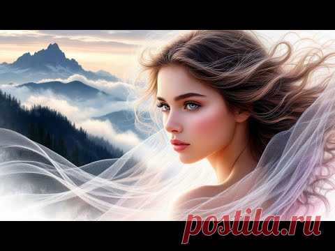 На изображении молодая женщина с длинными, волнистыми волосами теплого каштанового оттенка, которые развеваются на ветру. Её лицо выражает спокойствие и уверенность, с нежным розовым румянцем на щеках. Женщина одета в легкую, полупрозрачную ткань, которая окутывает её плечи и плавно перемещается вместе с ветром. Её глаза, с едва уловимым блеском, смотрят вдаль, в пространстве, которое доминирует голубоватой дымкой гор на фоне. Горы утопают в тумане, создавая атмосферу таинственности и мечтательности. Свет мягко падает на её лицо, выделяя его на фоне сумеречных золотистых и бледно-розовых оттенков горизонта. Такое освещение придаёт изображению приглушенную и почти космическую ауру. Композиция создает ощущение нестабильного движения, как будто модель находится на грани снов и реальности, что подчеркивается фразой "Ты во сне и наяву (стихи Роман Синицын)". В целом, сцена вызывает впечатление, будто зритель наблюдает за моментом пробуждения мечты на фоне величественных природных пейзажей.