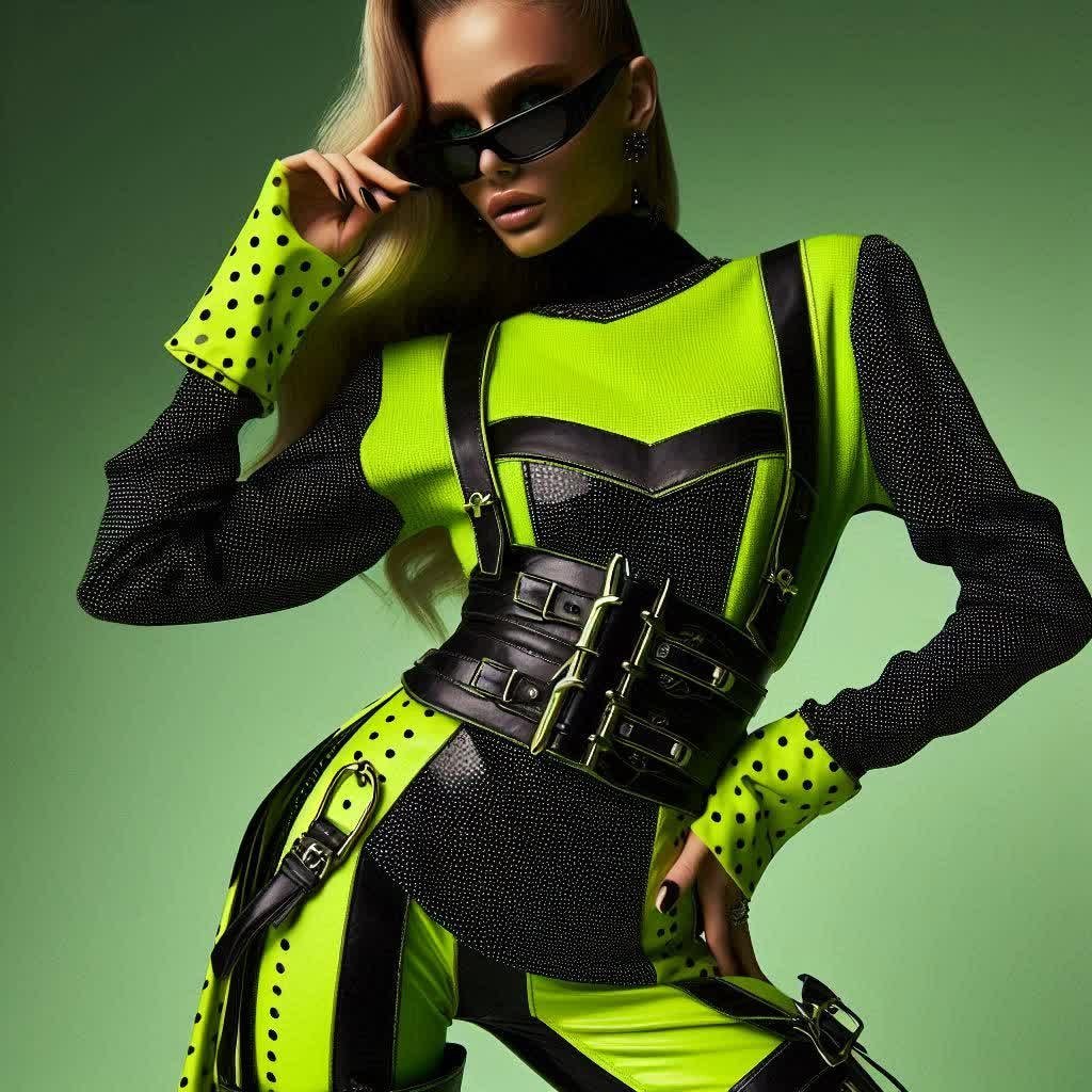 На изображении представлен яркий образ в неоновом стиле. Женщина в стильном костюме неонового зеленого цвета с черными акцентами. Наряд состоит из плотно прилегающей куртки и штанов, украшенных черными ремнями с металлическими пряжками и элементами. Композиция одежды акцентирует внимание на дерзкой элегантности и авангардном подходе, создавая эффект футуристичной моды. Женщина демонстрирует уверенную позу, приподнимая солнцезащитные очки и добавляя нотку таинственности и дерзости. Светло-зеленый фон усиливает цветовую палитру наряда. Свет направлен четко, подчеркивая текстуры материала и создавая выраженную глубину изображения. Эмоциональная атмосфера заряжена уверенностью и эксклюзивностью, что подтверждает вдохновляющий имидж, созданный нейронной сетью Dalle 3. Вдохновляющие элементы относятся к современным трендам, подчеркивая индивидуальность и смелость выбора.