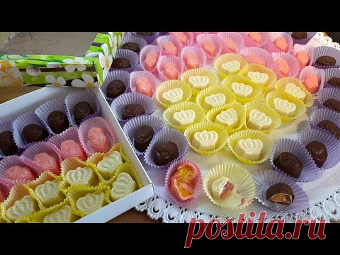 На изображении представлены конфеты в разнообразных формах и цветах, красиво разложенные в бумажных капсулах. Конфеты различных оттенков – от нежного розового до насыщенного коричневого – располагаются на поверхности, покрытой кружевной салфеткой, что добавляет утончённости и домашнего уюта. В левой части изображения видна коробка с цветочным рисунком на крышке, в которой аккуратно уложены сладости. Преобладают сердцевидные конфеты с рельефным узором белого цвета. Несколько конфет, возможно, трюфели с начинкой, имеют шоколадное покрытие. Общая композиция создаёт атмосферу праздничного настроения и аппетита. Внешний вид сладостей предполагает ассоциации с десертами "Ганаш на белом шоколаде Малина и Манго". Свет равномерно освещает объекты, акцентируя внимание на их цветах и текстуре.