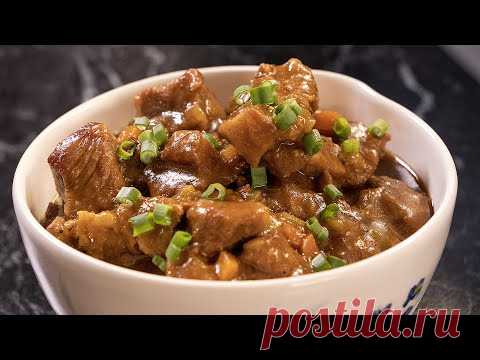 На изображении представлено блюдо гуляш из свинины в миске, выполненной из белой керамики с узором голубого цвета. Блюдо выглядит аппетитно, кусочки сочного, поджаристого мяса покрыты густым коричневым соусом, что придает им блеск. Поверх гуляша разбросаны свежие зеленые луковые кольца, которые добавляют яркости и свежести. Фон изображения выполнен в мрачных тонах, что создаёт контраст с яркой белизной миски. Освещение акцентирует внимание на текстуре мяса, подчеркивая его сочность и аппетитность. Антураж и компоновка изображения подчёркивают уютный, домашний характер блюда. Общее настроение создаёт ощущение теплоты и гостеприимства. Текстура свинины на фото кажется мягкой и нежной. Композиция сосредоточена на центральной части кадра, оставляя фон в легком расфокусе, чтобы акцентировать внимание на блюде.