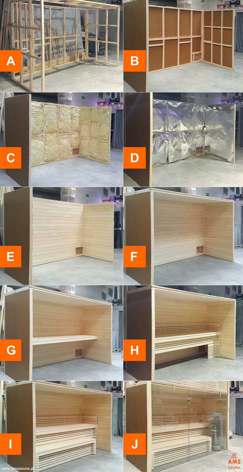 Изображение представляет собой пошаговую сборку сауны в десяти кадрах, расположенных в два ряда. В первом кадре ("A") видна деревянная рама, показывающая основу конструкции.Большие горизонтальные и вертикальные брусья создают каркасную структуру, видны светлые деревянные текстуры. Во втором кадре ("B") предоставляются стены из древесноволокнистых плит, которые создают крепкий контур. В третьем кадре ("C") показан добавленный слой теплоизоляции, выполненный из желтой стекловаты. Элементы с изоляцией видны внутри деревянной рамы. В четвертом кадре ("D") появляется слой алюминиевой фольги поверх утеплителя, создающий блестящую, отражающую поверхность. Следующие кадры (от "E" до "J") последовательно показывают наращивание внутренней обшивки: стены и потолок обшиваются светлыми деревянными панелями, включая скамьи, что видно на кадрах от "G" до "I". На финальном кадре ("J") установлена прозрачная стеклянная дверь, завершающая сборку сауны. На снимке отсутствуют люди, общая цветовая гамма — светлые древесные тона, смешанные с яркими металлическими отблесками. Сцена освещена умеренным белым светом, который рассеивает тени по плиточному полу.