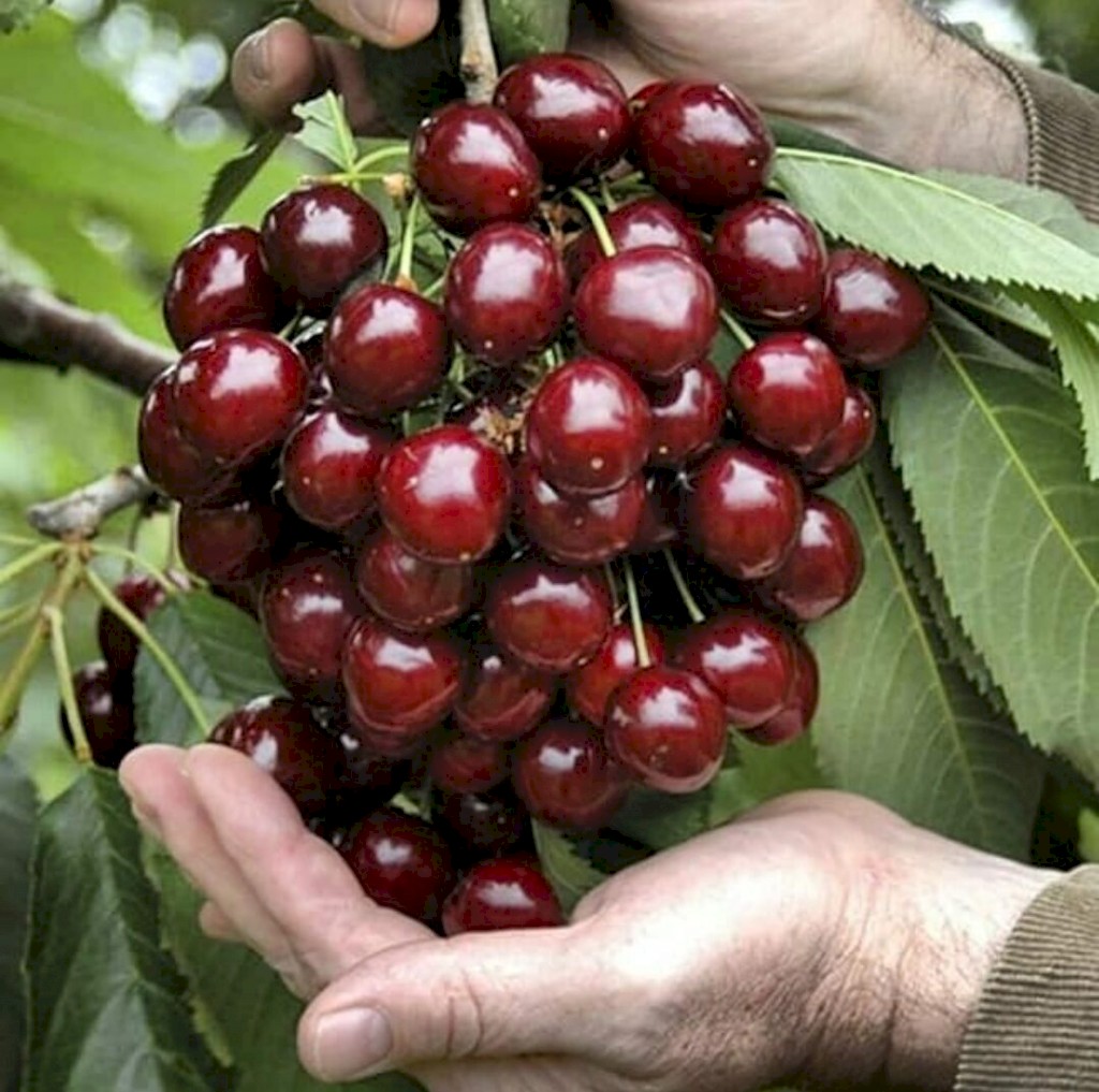 На изображении крупным планом показана ветвь дерева с сочными, зрелыми и ярко-красными вишнями, которые держат руки взрослого человека. Цвет вишен насыщенный и блестящий, что говорит о их свежести и зрелости. Кожа плодов гладкая, без видимых дефектов. Руки, с легким загаром и одетые в светлую одежду, аккуратно придерживают гроздь, придавая изображению чувство заботы и бережного отношения к природе. На заднем плане видны зеленые листья, создающие естественную контрастную фон для яркости плодов. Сцена освещена натуральным светом, придающим изображению реалистичность и подчеркнутую текстуру объектов. Композиционно снимок сфокусирован на центральной части грозди, создавая иллюзию перспективы и глубины. Этот снимок вызывает ассоциации с летом, природой и садоводством. Также можно заметить надпись на фото, выполненную в светлом шрифте в правом нижнем углу. Вся картина передает атмосферу прирученного сада, где человек и природа взаимодействуют в гармонии.