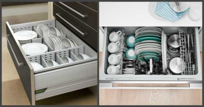 Изображение демонстрирует два способа хранения посуды в кухонных шкафах. Слева находится выдвижной ящик, специально организованный для хранения тарелок. Он выполнен из светлого дерева с металлическими перегородками. В этом ящике аккуратно расставлены белые тарелки разного размера, каждая из них уложена в отдельный отсек. Справа показан посудомоечная машина с посудой, в том числе чашками, тарелками и столовыми приборами. Посудомоечная машина выполнена из нержавеющей стали и гармонично вписывается в современный интерьер кухни. Светлый цвет стен и мебели придает общую атмосферу комфорта и уюта. Композиция включает сочетание функциональности и эстетики, подчеркивающие современный подход к организации пространства. Текстура материалов гладкая, что типично для современных кухонь. Чистота и порядок на изображении создают ощущение свежести и упорядоченности. "Все под рукой: интересные варианты хранения посуды — Домашний уют" может быть созвучно с темой изображения, советуя практичные решения для кухни.