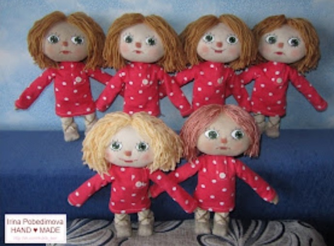 На изображении показаны шесть кукол ручной работы, которые изображают персонажа Домовенка Кузю, созданного Ириной Победимовой. Куклы располагаются на двух уровнях: три вверху и три внизу. Все они одеты в красные рубашки в белый горошек и имеют волосы разных оттенков: от светло-русого до рыжего. Их лица с большими выразительными глазами и маленькими улыбками передают дружелюбную атмосферу. Куклы стоят на фоне синих и серых тонов, который создает контраст и придаёт изображению глубину. Мягкий свет освещает композицию, подчёркивая текстильные текстуры кукол и их одежды. В нижнем левом углу заметна надпись "Ирина Победимова HAND MADE", что свидетельствует о творческом подходе и ручной работе мастера.