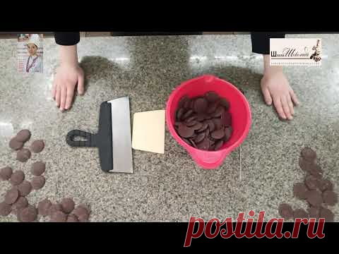 На изображении видно гладкую столешницу серого цвета, на которой разложены коричневые шоколадные диски. Справа стоит яркое розовое ведро с загнутыми краями, наполненное этими же дисками. Рядом лежит металлический шпатель с черной пластиковой ручкой и светло-желтый квадратный лист, напоминающий пергамент. Руки, принадлежащие человеку в черной одежде, находятся по бокам, слегка расставлены на столе. Свет освещает столешницу, создавая мягкие блики, что добавляет изображению дополнительной глубины и объемности. В верхней части, справа можно заметить логотип с текстом на кириллице и рисунком шеф-повара. Слева виднеется небольшая картинка с фрагментом фотографией и текстом. Настроение изображения спокойное и сосредоточенное, намекающее на процесс приготовления кондитерского изделия. Эта композиция ассоциируется с творческим процессом и рукодельным производством. "Корпусные конфеты с апельсиновым ганашем" добавляют к общей теме изображении, предлагая вероятный вкус продукта.