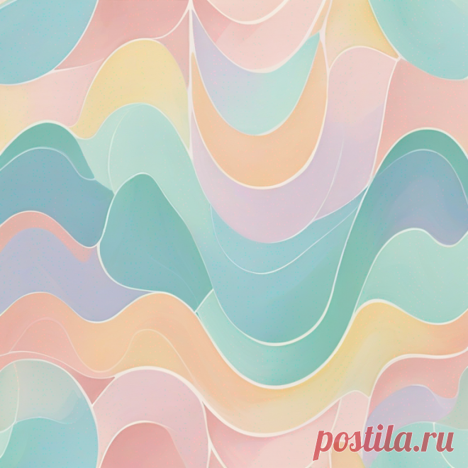 Изображение представляет собой абстрактную композицию из плавных, волнообразных линий, которые создают иллюзию движения и глубины. На картине использованы пастельные оттенки зелёного, розового, голубого и оранжевого цветов. Линии переплетаются и наслаиваются друг на друга, создавая богатую текстуру и динамичный узор. Впечатление лёгкости и воздушности подчёркивается использованием мягких, приглушённых цветов и нежных переходов между тонами. Сочетание форм напоминает абстрактные пейзажи или стилизованные образы природы. Картина вызывает ощущение умиротворения, играя с визуальными и эмоциональными восприятиями зрителя.