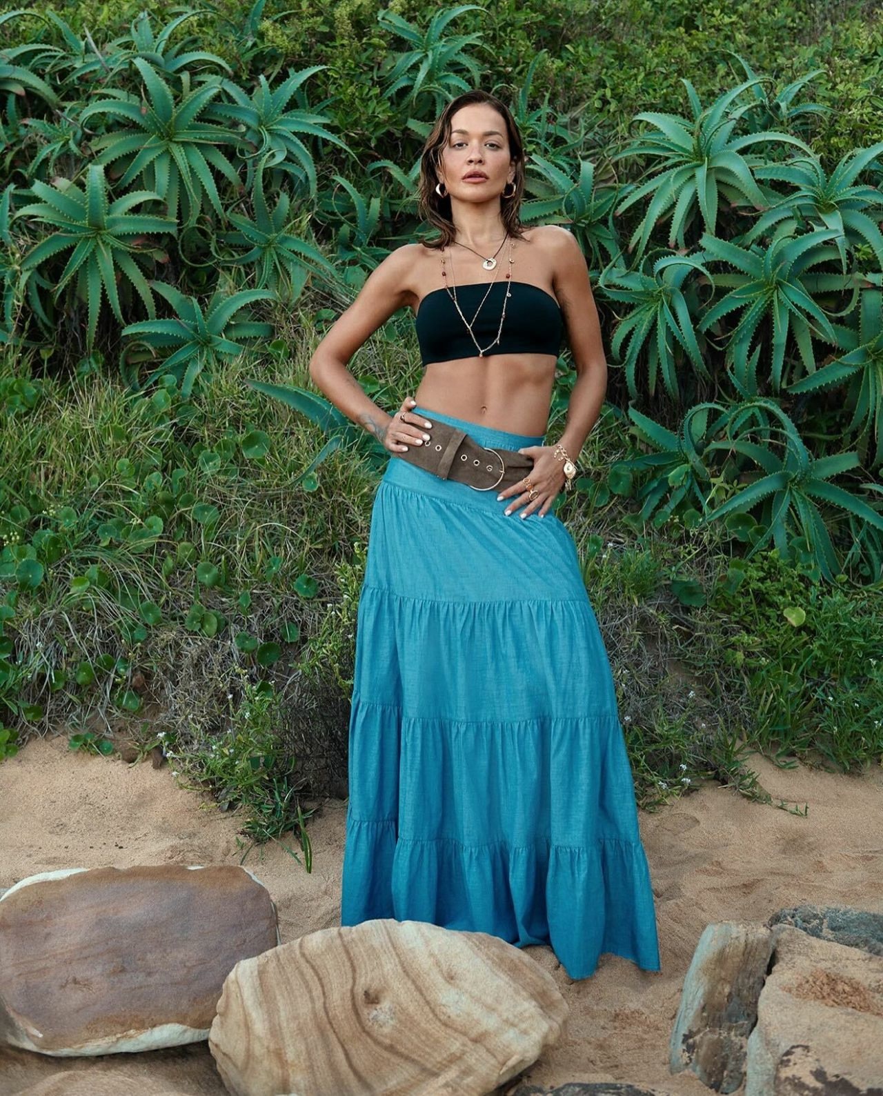 На изображении женщина стоит на песчаном фоне побережья, позируя среди зелёных тропических растений. Она одета в стильный черный топ без бретелек и длинную бирюзовую юбку с многослойным кроем, подчёркивающую её фигуру. На шее и запястье украшения из золота, подчёркивающие изысканный стиль. Выражение её лица уверенное и загадочное, она смотрит прямо в камеру, а её поза свидетельствует о внутренней силе и уверенности. У женщины золотистые серьги-кольца и браслет, подчеркивающие современность образа. Светлая кожа контрастирует с насыщенно-зелёным фоном. Её волосы уложены в стиле лёгких волн, создавая ощущение расслабленности и естественности. Камера захватывает её в полный рост, где передний план украшают крупные камни, добавляющие природный элемент композиции. Създвинутый в сторону, текст «Подборка фотосессий звезд и знаменитостей 25.062025» укладывается в общую атмосферу изысканности и современности этого снимка.