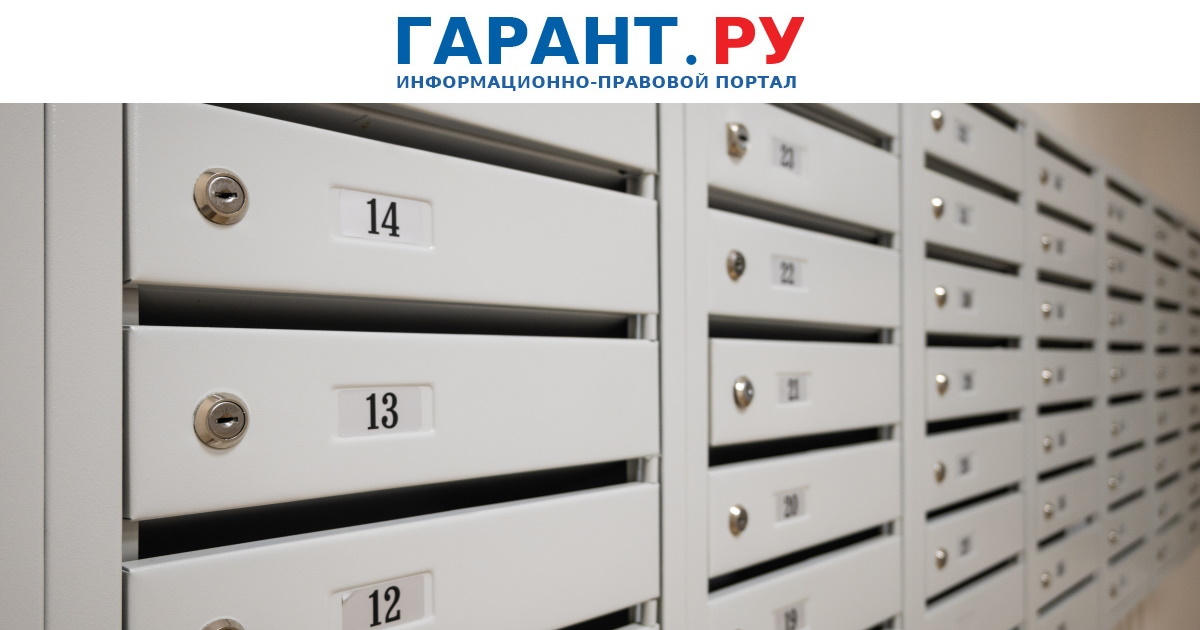 На изображении показаны ряды белых почтовых ящиков, расположенные в подъезде жилого дома. Каждый ящик снабжен металлическим замком и небольшими черно-белыми номерами, такими как 12, 13 и 14. Их поверхность ровная и гладкая, что создает ощущение строгости и порядка. Фотография сделана так, что ящики уходят вдаль, создавая впечатление глубины и перспективы. Слева вверху видно текст с логотипом "ГАРАНТ.РУ", выполненный в сине-красных тонах, что контрастирует с белизной ящиков. Освещение нейтральное, мягкое, подчеркивающее форму и текстуру металла. В верхней части изображения размещен слоган, касающийся обязательного согласия соседей при сдаче квартиры в аренду, что подчеркивает юридическую тематику. Аналогично, наличие названия "ГАРАНТ" указывает на информационно-правовое содержание, что важно для понимания контекста.