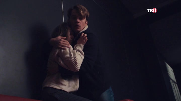 Изображение передает напряженную и эмоциональную сцену. На переднем плане двое молодых людей: мужчина и женщина, сидящие вместе на темном фоне. Мужчина, одетый в темное пальто и светлый шарф, обнимает женщину, создавая ощущение защищенности и близости. Женщина в белом свитере притулилась к мужчине, проявляя волнение и доверие. Легкое скрытое освещение создаёт атмосферу драматичности и интимности. На заднем плане видны темные стены, которые усиливают чувство изолированности и уединения. В правом верхнем углу видно название телеканала "ТВЦ", указывая на возможную принадлежность сцены к телевизионной программе или фильму. Внизу справа светится красный текст, что добавляет контраст и акцент на общую композицию. Это создает атмосферу внезапности и неопределенной угрозы.
