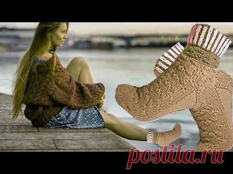 На изображении видно молодую женщину, сидящую на деревянном настиле у водоема. Её взгляд направлен в сторону, создавая задумчивую и спокойную атмосферу. Она одета в крупный вязаный свитер коричневого цвета и легкое платье с узором, сочетая комфорт и стиль. Длинные волосы девушки спадают на плечи, подчёркивая её естественность и нежность. На переднем плане изображены вязаные носки сложного узора, выполненные из коричневой пряжи с цветными полосками на манжетах. Этот элемент добавляет ощущение тепла и уюта осеннего или зимнего времени года. Фон размытый, содержится слегка холодные оттенки, что усиливает общее чувство уединения и размышления. Освещение мягкое, без резких теней, создавая гармоничную композицию. Композиция изображения сосредоточена на комфортной одежде и уютной обстановке, способствуя ассоциациям с домашней или природной теплотой.