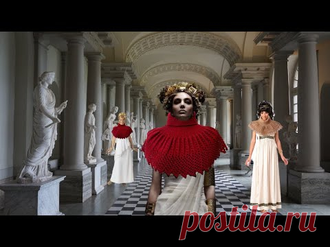 Изображение представляет собой коллаж, в котором соединены элементы древнегреческой архитектуры и современной моды. На переднем плане женщина в белом пеплосе с массивным красным вязаным воротником. Голова украшена венком из цветов, создающим атмосферу дрeвнегреческой мифологии. Позади нее две женщины, также одетые в греческие одеяния, но с различной текстурой и цветом воротников. Архитектура фона включает высокие колонны и статуи, характерные для античных зданий, создавая ощущение величественной галереи. Пол выложен черно-белыми квадратами, добавляя глубину и контраст в изображение. Свет, падающий сбоку, усиливает тени и подчеркивает объемность фигур. В целом, композиция гармонично сочетает классическую элегантность с современными акцентами, передавая чувство силы и драматичности.