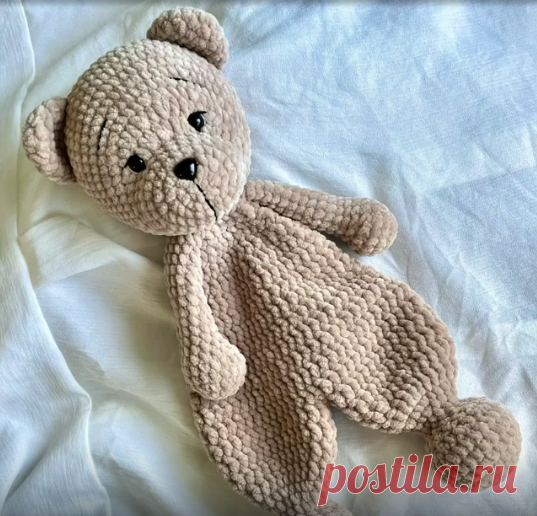 На изображении представлен плюшевый комфортер в виде медведя, выполненный в технике вязания крючком. Медвежонок имеет приятный светло-бежевый оттенок и отличается мягкой фактурой материала, создающей уютное впечатление. Выразительное личико с черными вышитыми глазами и маленьким черным носиком придает игрушке дружелюбный вид. Ушки и лапки аккуратно связаны, создавая ощущение ручной работы. Комфортер расположен на белой ткани, вероятно, это простыня, создающая контрастное фоновое решение. В левой нижней части рисунка есть надпись на русском языке, которая добавляет контекста происходящему, упоминая видео публикацию от «Мастерство в Искусстве». Освещение естественное, слегка рассеянное, создающее мягкие тени и добавляющее глубину изображению. В целом, фотография передает ощущение тепла и уюта, вызывая ассоциации с детской заботой и комфортом.