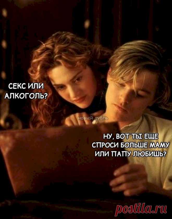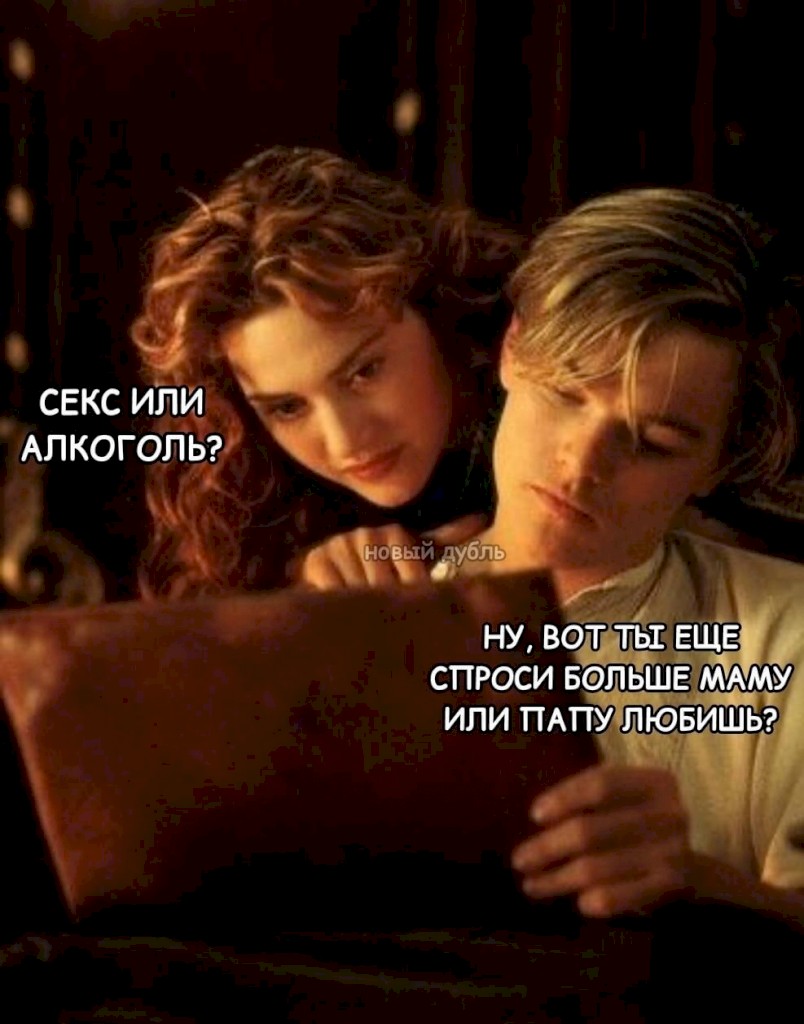 На изображении два человека, один из которых, судя по всему, читает книгу или изучает документ, в то время как другой внимательно наблюдает за происходящим. Они находятся в помещении с тёмной, уютной атмосферой, создаваемой тёплым светом, который акцентирует внимание на выражении их лиц. Внимание привлекает диалог, текст которого появляется на изображении: "СЕКС ИЛИ АЛКОГОЛЬ?", на что следует ответ: "НУ, ВОТ ТЫ ЕЩЕ СПРОСИ БОЛЬШЕ МАМУ ИЛИ ПАПУ ЛЮБИШЬ?". Комментируя ситуацию, можно предположить, что изображение сопровождается элементом юмора или сатиры. Один из людей, кто читает, одет в светлую рубашку, а другой человек имеет волнистые волосы и выражает заинтересованность и лёгкую улыбку - это может добавить оттенок близости или доверия к изображению. Освещение исходит, вероятно, от лампы или другого источника света, что создаёт игру теней и подчёркивает замкнутость сцены вокруг персонажей. Всё это поддерживают сцену интимного взаимодействия. Выпуск анекдотов создаёт атмосферу легкости и шутливости.