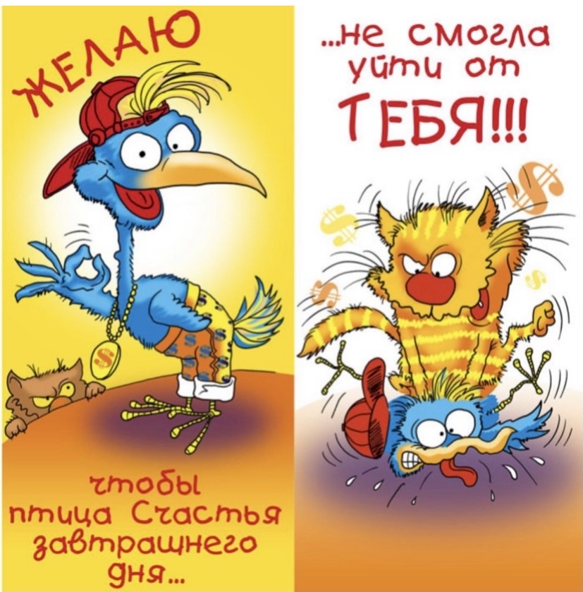 Это изображение представляет собой комическую сценку с мультяшными персонажами, яркими и насыщенными цветами. На левой части изображение изображена голубая птица со смешными, выпученными глазами. Она одета в красную бейсболку, перевернутую назад, и золотую цепочку с долларовым знаком. Птица демонстрирует жест рукой, как будто желает удачи. На фоне виден желтый цвет, а рядом с этой птицей находится рыжий кот с улыбкой. В правой части изображения изображен тот же кот, сцепившийся с птицей, он выглядит оживленно и агрессивно, как будто пытается удержать её. На этом фоне также преобладает желтый цвет с элементами музыкальных символов. На изображении присутствует текст на русском языке, который добавляет юмористический контекст сцене: «ЖЕЛАЮ... чтобы птица Счастья завтрашнего дня... не смогла уйти от ТЕБЯ!!!». Это создает обстановку легкости и забавности, подчеркивая дружелюбный характер иллюстрации.