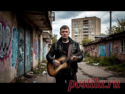 На изображении представлен мужчина с гитарой, стоящий в заброшенном дворе жилого района. Мужчина среднего возраста одет в кожаную куртку, что придаёт ему грубый и харизматичный вид. Татуировки видны на его руках, подчёркивая его бунтарский образ. Фон изображения состоит из двухэтажных зданий, покрытых граффити, со следами времени и запущенности. В центре кадра расположено высокое панельное здание, которое добавляет глубину сцене и атмосферу городской депрессии. Небо серое и облачное, света мало, что создаёт мрачное настроение. На земле виден мусор, передающий аспект запустения и социальной неустроенности. Мужчина сосредоточен на игре на гитаре, делая акцент на искусстве как на способе выражения и преодоления сложностей. Контраст текстуры кирпичных стен и гладкого дерева гитары подчёркивает композицию. Впечатление от сцены усиливается текстом "Судьба ломала (автор стихов Роман Синицын)", который объединяет тему борьбы и устойчивости.