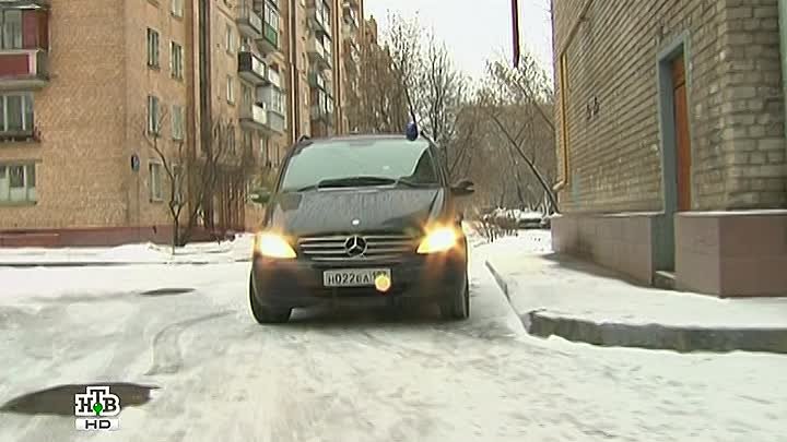 На изображении показан серый минивэн марки Mercedes, который едет по заснеженной улице. Автомобиль выделяется на фоне многоэтажных зданий из кирпича теплых оттенков, которые находятся слева. Справа видна стена здания, покрытая серым кирпичом. Атмосфера зимняя, вокруг заметен снег, отсутствует яркое освещение – день пасмурный и сероватый. Автомобиль движется по заснеженному и, вероятно, скользкому покрытию, что создает ощущение динамики. На лобовом стекле автомобиля видны отражения без определенной формы, что добавляет к эффекту движения. Машина оснащена сигналом сверху, что может указывать на принадлежность к особым службам. На передней части автомобиля отчетливо виден значок бренда Mercedes. На заднем плане видны деревья в зимнем убранстве, а также элементы городской инфраструктуры. Текст "Игра / Серии: 01-10 из 20 [2011, Детектив]" помогает создать ощущение сценарной интриги, добавляя элемент тайны или действия, связанного с детективом.
