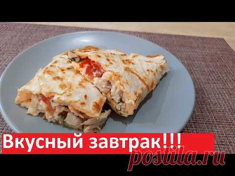 На изображении представлена аппетитная порция блюда на серой тарелке, расположенной на текстурированной подставке темно-коричневого цвета. Блюдо представляет собой тортилью или лаваш, плотно свернутый и наполненный начинкой, содержащей кусочки курицы, ярких красных и зеленых овощей, вероятно, болгарского перца. Аппетитная золотистая корка изделия четко выделяется на фоне остальных элементов ресторана. В кадре присутствует текст на красном фоне с белыми буквами, излучающий динамичную и позитивную атмосферу, ориентированную на приятное начало дня. Размер ломтиков и их оформление указывают на удобное решение для завтрака, которым можно насладиться дома. Блюдо выражает простоту и насыщенность вкуса, что подчеркивается текстом, указывающим на высокое содержание белка и сытность блюда. Освещение яркое, дневное, что создает свежее и бодрое настроение, соответствуя концепции завтрака. Изображение фокусируется на основном блюде, минималистичный фон помогает акцентировать внимание на его текстуре и ингредиентах, предлагая зрителю ощутить вкусный и полезный прием пищи. Это гастрономическое путешествие с оттенком средиземноморских мотивов, которое обеспечивает не только потребность в питательных веществах, но и эстетическое удовлетворение.
