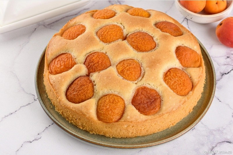 На изображении представлен аппетитный пирог с абрикосами, расположенный на керамической тарелке. Пирог имеет золотисто-коричневую корочку и равномерно распределённые половинки абрикосов, погружённые в тесто. Абрикосы ярко-оранжевые, с лёгкой румяностью, придают пирогу свежий и вкусный вид. Поверхность пирога выглядит пористой и мягкой, что свидетельствует о нежной структуре. Слева на заднем плане видна белая поверхность, возможно, стол или скатерть, создающая контраст с яркими оттенками выпечки. В правом верхнем углу размещён небольшой контейнер с целыми абрикосами, добавляющий композиции фруктов и подчеркивающий натуральный аспект блюда. Освещение мягкое, без резких теней, что указывает на студийную съёмку. На переднем плане слегка размыты тени, создающие ощущение глубины. Внизу изображения присутствует надпись, выполненная красным шрифтом, которая соответствует цветовой гамме общего визуала. Кроме этого, рядом с изображением размещён текст, описывающий ингредиенты и процесс приготовления пирога, включая 400 г абрикосов, 230 г пшеничной муки, 200 г сахара, 120 г сливочного масла и других элементов рецепта.