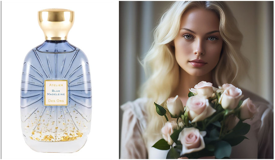 На изображении представлена женщина с длинными светлыми волосами, держащая букет свежих розовых роз. Она одета в элегантную светлую одежду, её выражение лица спокойное и задумчивое, подчеркивающее атмосферу утончённости. Фон размыт, создавая мягкий и уютный световой эффект. Рядом с изображением женщины находится флакон духов Atelier Des Ors, модель Blue Madeleine. Флакон выполнен из прозрачного стекла с золотыми деталями, его элегантная форма украшается рисунком в виде лучей, которые добавляют динамизма и изысканности. Название парфюма указано на золотой этикетке в центре флакона. Изображение духов и женщины вместе создают образы романтичной и изысканной атмосферы с намеком на «Чайные ароматы». Видимые детали создают ощущение роскоши и эстетичного наслаждения.