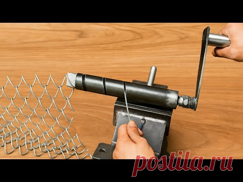 На изображении представлен процесс создания металлической сетки при помощи ручного станка. На переднем плане видно, как пара рук закрепляет проволоку на металлическом устройстве с помощью ручного рычага. Проволока серебристого цвета образует регулярную сетчатую структуру, а фон выполнен в теплых деревянных оттенках, что подчеркивает ремесленный характер сцены. Материал проволоки имеет блестящую гладкую текстуру, типичную для стали, придавая изображению индустриальный акцент. Форма ячеек сетки характерна для плетеной металлической сетки, создавая четкие узоры ромбовидной формы. Руки показывают целеустремленность и точность в управлении процессом, что подчеркивается мягким светом, создающим уютную и сосредоточенную атмосферу. Центральное расположение инструмента и сетки создает гармоничную композицию, акцентируя внимание на технологическом процессе.