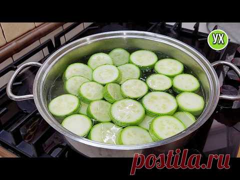 На изображении представлена большая металлическая кастрюля с двумя ручками, установленная на газовой плите. В кастрюле видно множество ломтиков кабачков, плавающих в воде. Кабачки нарезаны толстыми кружками и имеют свежий светло-зеленый цвет, что говорит об их свежести. Вода в кастрюле почти доведена до кипения, поверхность слегка поблескивает при свете. Кастрюля из нержавеющей стали отражает окружающую обстановку, создавая ощущение чистоты и аккуратности. Светлые коричневые элементы кухни на заднем плане создают теплую, домашнюю атмосферу. В верхнем углу изображения имеется графический элемент с текстом "УХ". Атмосфера сценки насыщена простотой и уютом домашнего приготовления. Возле изображения выделяется текст, связанный с легкими рецептами приготовления кабачков и универсальным соусом, что намекает на образовательный или кулинарный контекст. Композиция изображения фокусируется на кабачках, что подчеркивает тему приготовления пищи и может быть частью кулинарного видео или рецепта.
