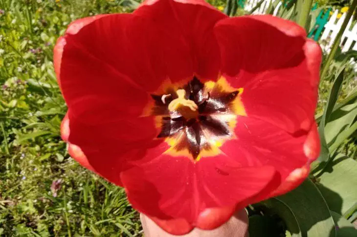На изображении крупным планом виден тюльпан с ярко-красными лепестками, занимающий центральное место в композиции. Внутри цветка заметна тёмная сердцевина с жёлтыми акцентами, создающими контраст по сравнению с насыщенно-красными лепестками. Текстура лепестков гладкая, с насыщенной окраской, которая подчеркивается ярким дневным светом. Позади цветка расплывчатый зелёный фон из травы, придающий глубину и естественность сцене. Небольшая теневая область подчёркивает объём и форму цветка. В правом нижнем углу изображения можно увидеть часть забора, а также заметно небольшое вкрапление белого и зелёного цветов, что может указывать на садовую обстановку. Подпись на изображении подчёркивает значимость правильного ухода за тюльпанами, чтобы они выросли гигантскими к следующему сезону.