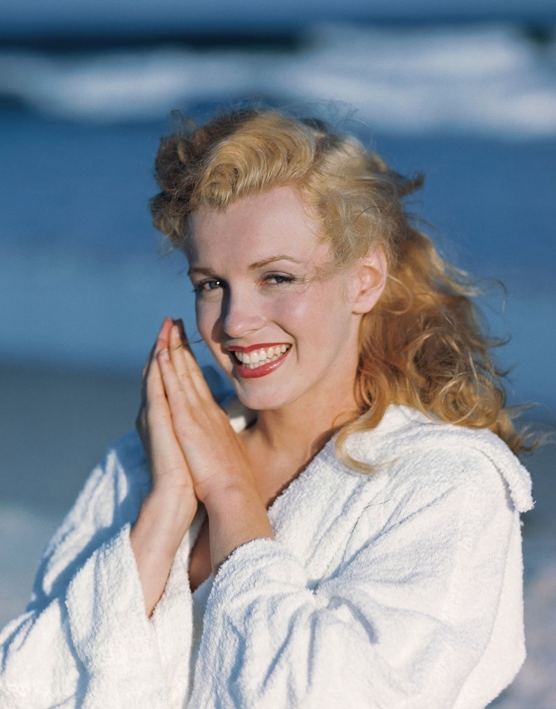 На изображении женщина с блондинистыми волосами, возможно, в духе 1950-х годов, находящаяся на пляже. Она одета в белый махровый халат, который придает уютную, расслабленную атмосферу, контрастируя с бушующими волнами на фоне. Женщина смотрит прямо в камеру, ее лицо украшает искренняя улыбка, глаза светятся добротой. Руки сложены в молитвенном жесте, что создает впечатление благодарности или умиротворенности. Освещение яркое, создающее теплую атмосферу, подчеркивая золотистый оттенок ее волос. Морской пейзаж на фоне придает изображению чувство свободы и свежести. Присутствие неподписанного текста "Мэрилин Монро", возможно, указывает на известную личность или стиль. Композиция кадра проста, выделяя центральную фигуру на фоне голубого океана.