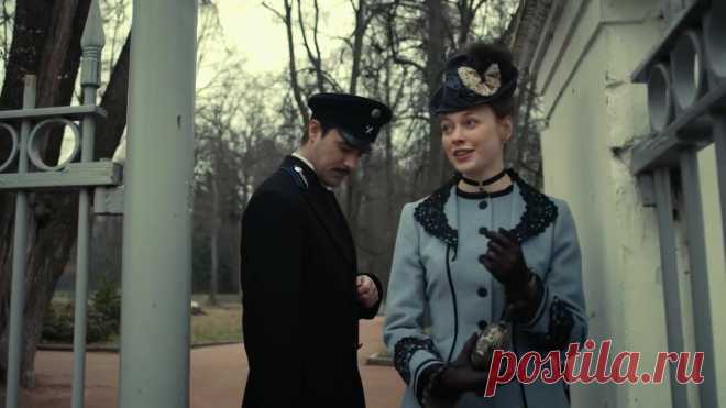 На изображении представлены двое людей в сцене, вероятно, исторического или детективного характера. Женщина одета в элегантное голубое пальто с черной декоративной отделкой и узорами, подчёркивающими воротник и манжеты. На её голове изысканная шляпка с декоративным элементом. Она носит темные перчатки и круглый кулон. Выражение её лица открытое и оживленное, она поддерживает разговор, видимо, рассказывая что-то интересное своему собеседнику. Мужчина в форменной одежде, возможно, это полицейская или военная форма тёмного цвета. Его взгляд опущен вниз, создаётся впечатление задумчивости или интригующего момента. Вокруг персонажей видно архитектурное сооружение светлого цвета и ограда, характерные для городских парков прошлых лет. Важно отметить время года — весенние или осенние месяцы, поскольку деревья обнажены и без листвы. Освещение мягкое, рассеянное, что может указывать на облачный день. Контекст и стиль одежды, вероятно, отсылают нас к концу 19-го или началу 20-го века, подчёркивая историческую атмосферу сцены.