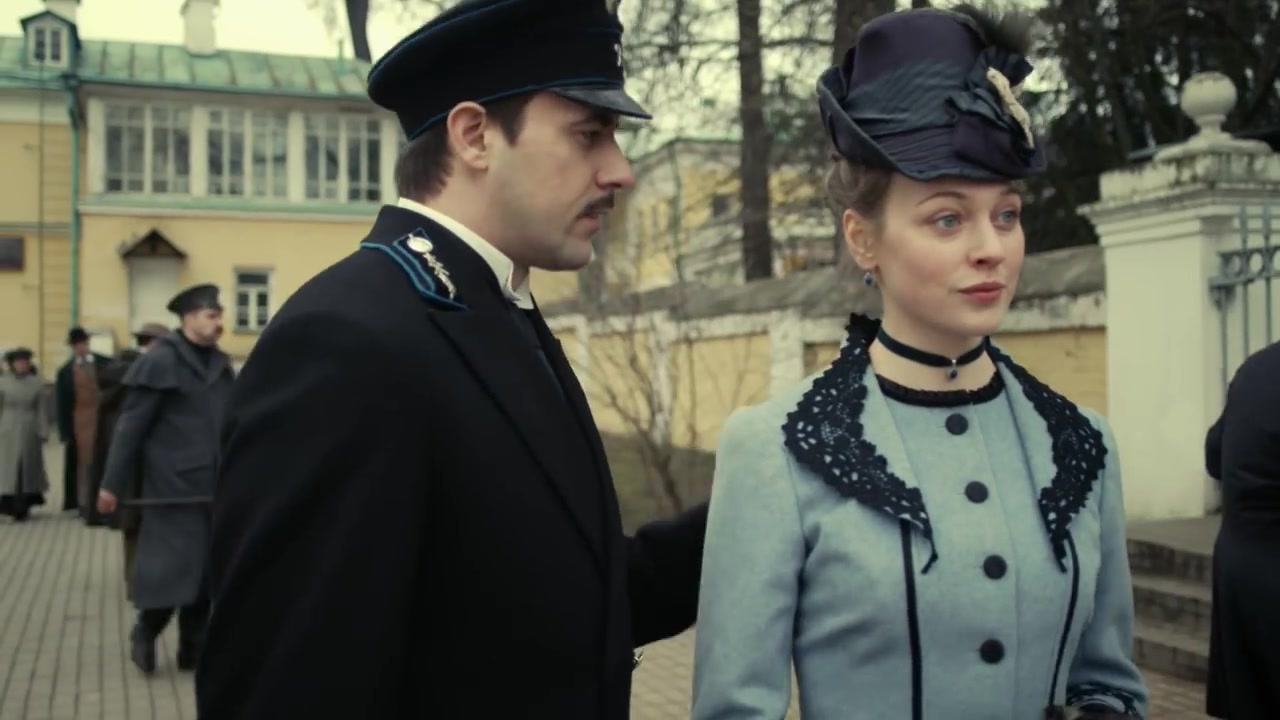 На изображении представлена пара, находящаяся на фоне исторической архитектуры, которая, вероятно, является зданием XIX века с большими окнами и светлым фасадом. Мужчина одет в тёмную форменную одежду с фуражкой, у него есть эполеты и значок на воротнике, что указывает на его полицейскую профессию. У него короткие тёмные волосы и усы. Женщина рядом с ним в светло-голубом пальто с чёрной отделкой и чёрной шляпой с перьями, привлекает внимание своей изысканностью. На ней чёрная ленточка на шее. Женщина смотрит в сторону, выражая лёгкое недоумение или задумчивость, тогда как мужчина сосредоточен на ней. На заднем плане проходят несколько людей в тёмной одежде, что создаёт атмосферу позднего вечера или раннего утра в прохладное время года. Свет мягкий и рассеянный, создавая спокойную и немного напряженную атмосферу. Текст "Анна-детективъ" добавляет элемент детективной истории или драматического события происходящего момента.