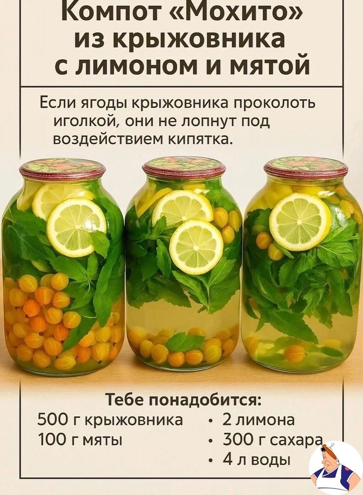 Изображение представляет собой рецепт компота «Мохито» из крыжовника с лимоном и мятой. На изображении видно три стеклянные банки, наполненные желтыми ягодами крыжовника, свежими зелеными листьями мяты и нарезанными лимонными кружками. Банки плотно закрыты металлическими крышками с красным орнаментом. Компоненты в банках образуют яркий цветовой контраст между зелеными и желтыми оттенками, привлекая внимание. На фоне расположена текстовая информация, которая дает практические советы по приготовлению, например, рекомендацию проколоть ягоды иголкой, чтобы они не лопнули под кипятком. В нижней части находятся ингредиенты и их количество: 500 г крыжовника, 100 г мяты, 2 лимона, 300 г сахара и 4 литра воды. Композиция очень ясная, с акцентом на центральную часть с банками, освещенными естественным светом, что создает свежую и аппетитную атмосферу.