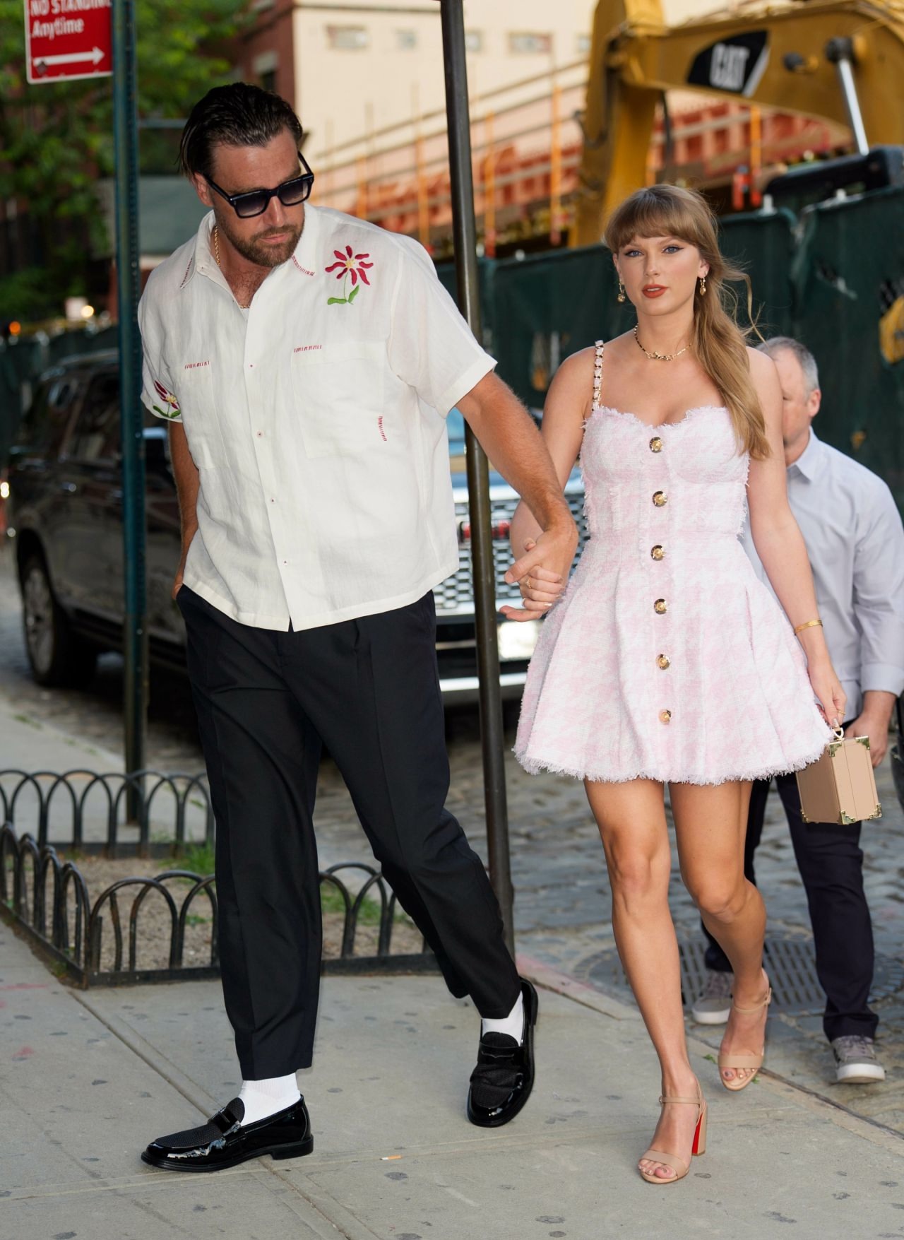 На фотографии изображены мужчина и женщина, гуляющие в городской среде. Мужчина одет в белую рубашку с короткими рукавами, на которой заметен вышитый цветочный узор, и черные брюки. На нем черные солнцезащитные очки и черные лоферы с белыми носками. Он держит за руку женщину, которая одета в короткое платье светло-розового оттенка с текстурой, напоминающей мех или перья, украшенное большими пуговицами. На ее ногах бежевые туфли на каблуке, в руках маленькая прямоугольная сумочка. На шее у нее золотая цепочка, а на запястье браслет. Светлые волосы уложены в хвост, а макияж выдержан в натуральных тонах. Фон изображения представляет собой улицу с зеленым ограждением и строительной техникой, что подчеркивает контраст между элегантностью парочки и повседневностью городской сцены. Свет на фото естественный, возможно, вечернее время, что создает теплую атмосферу.